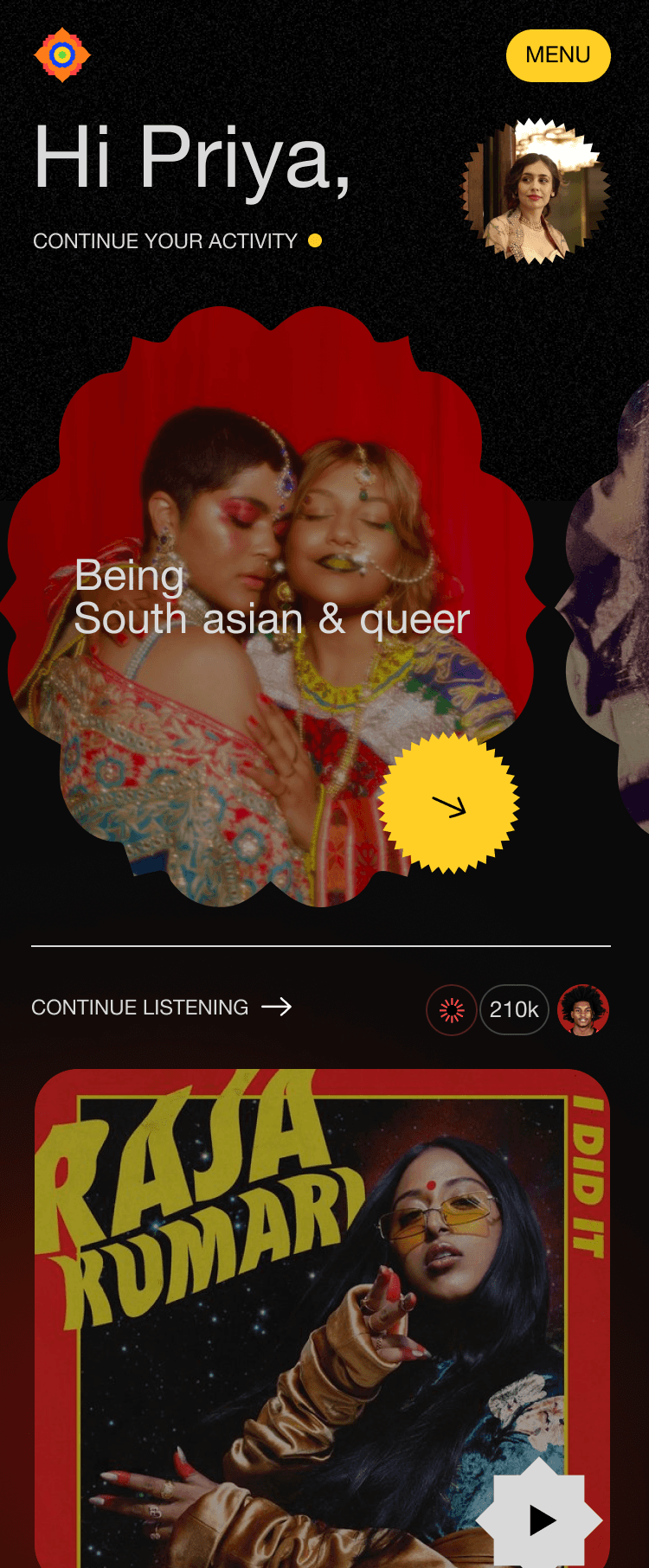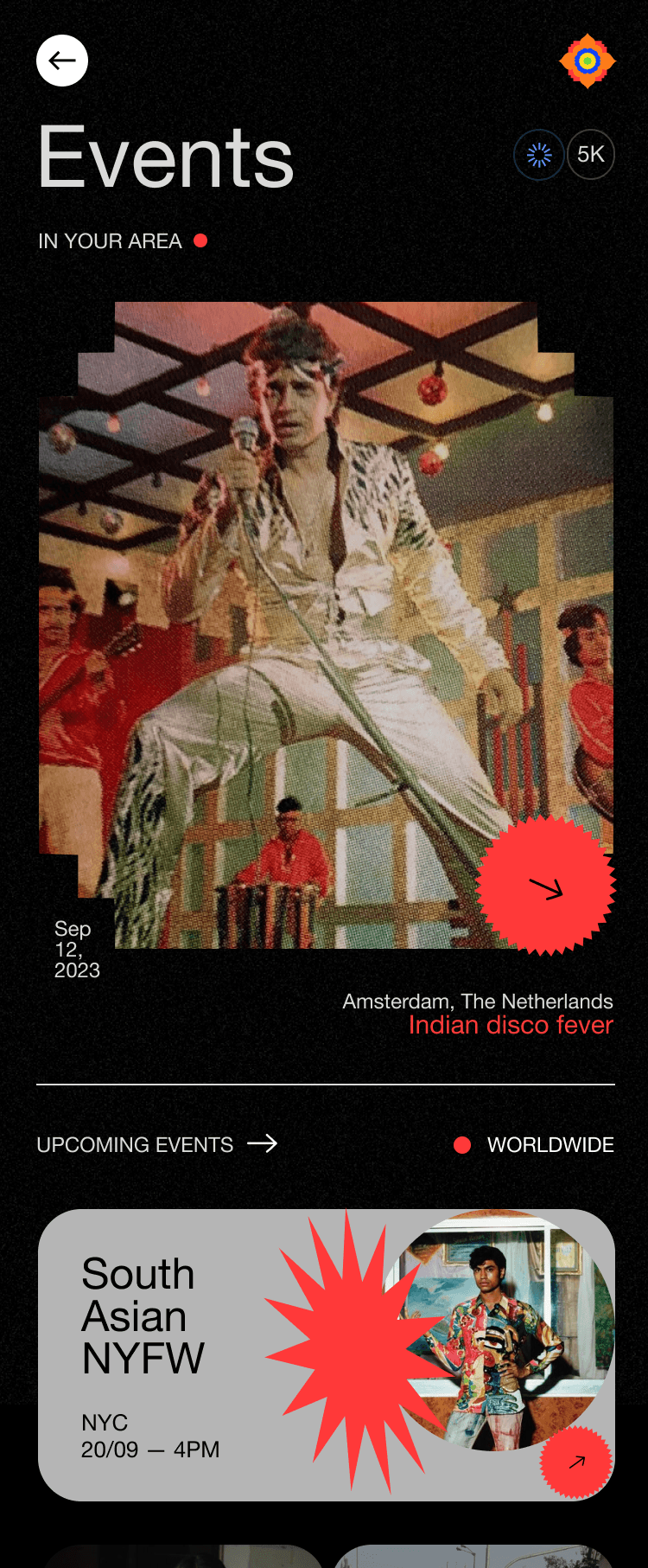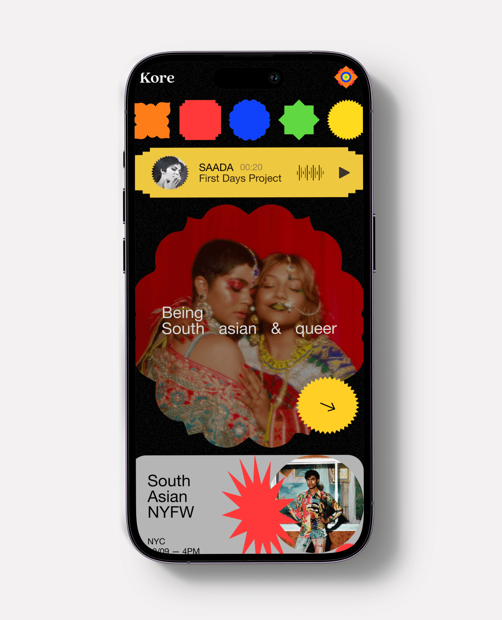 Kore's design system was built around a central tension: How do you create a visual language that feels authentically South Asian without reducing a continent of cultures to a single aesthetic? Rather than building another generic social feed, Kore aggregates cultural touchpoints into a single resource reducing the friction of finding community across fragmented platforms.