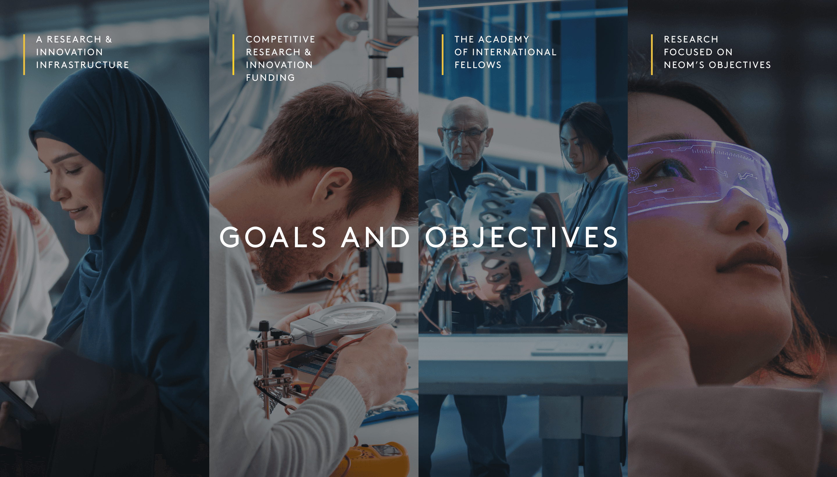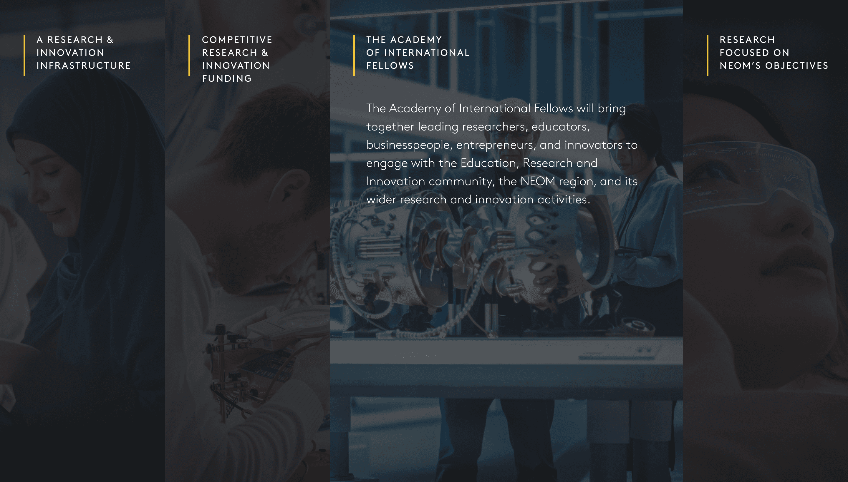 The Education, Research and Innovation Sector aims to transform education into a lifelong experience that utilizes cutting-edge, high-tech, and personalized learning capabilities, and inspire the world’s greatest minds. We were challenged to reflect these points by designing a web page for desktop and mobile focusing on this particular sector. Each sub-brand required its own visual personality while remaining cohesive within NEOM's broader identity. The education platforms needed to feel aspirational yet accessible communicating a vision of lifelong, technology-driven learning to global talent and institutional partners. The science platforms needed to convey authority and innovation, speaking to researchers, academics, and investors simultaneously. The design approach prioritised clarity and scale- large, confident typography, immersive imagery, and purposeful white space to let the ambition of the project breathe without overwhelming the user.